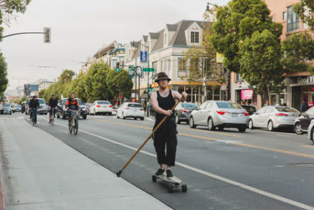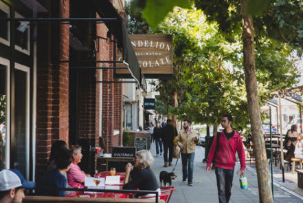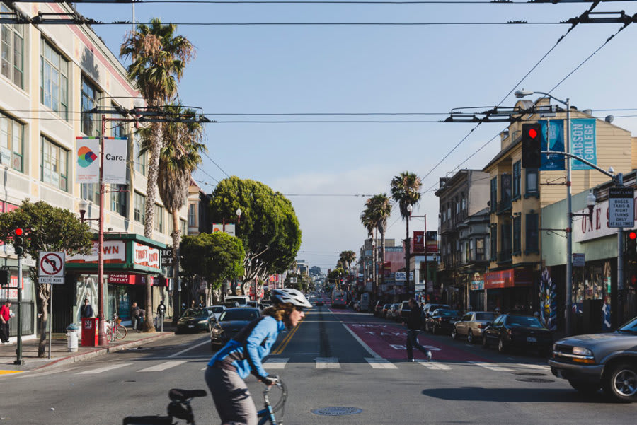 A vibrant populace on Valencia Street and side streets lined with Victorian and Edwardian architecture.